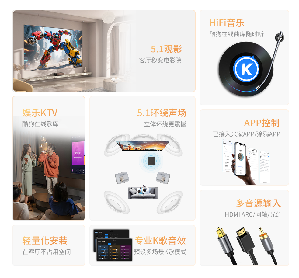 2. 操作便捷化,契合智能生活习惯家庭影 K 深度适配智能家居的操作逻辑,摆脱了传统影音设备复杂的按键操作。目前主流产品均支持 APP 远程控制,部分已接入米家、涂鸦等主流智能家居平台,可通过手机端实现设备开关、模式切换、音效调节等功能。更关键的是语音识别技术的应用,用户通过语音指令即可联动相关设备,无需手动操作,大幅降低了使用门槛。